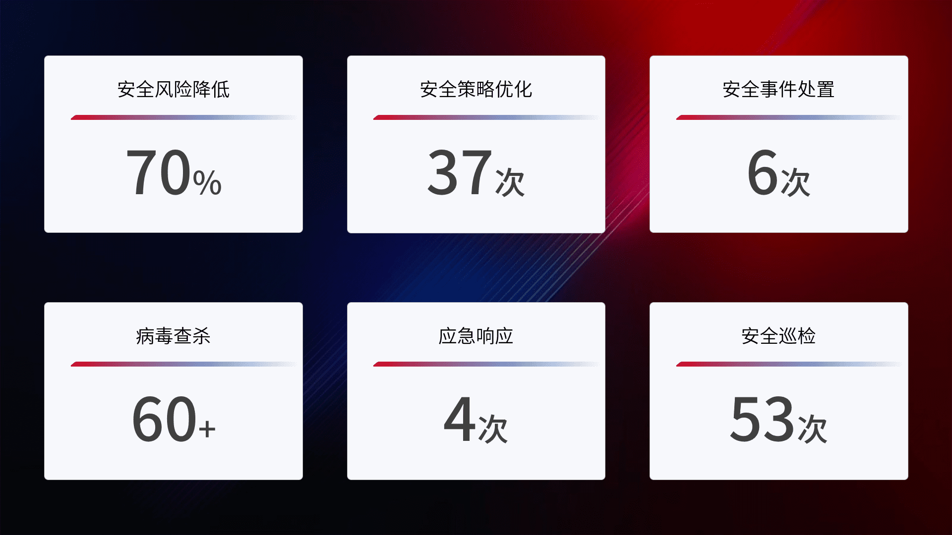 提供全面的安全事件报告体系,,,,包括处置报告、、、周报、、、季度和年度总结,,结合持续监控,,,帮助客户深入了解网络安全状况。。。