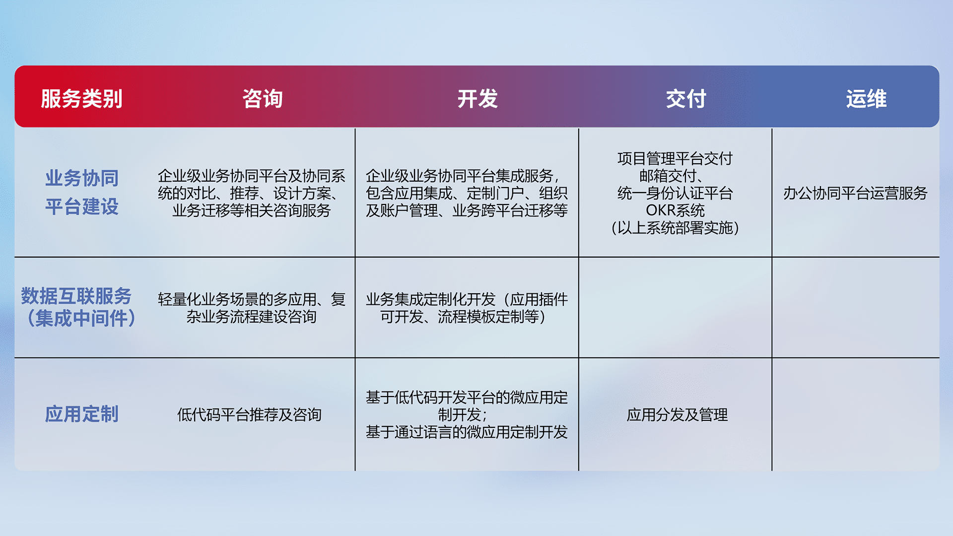 针对钉钉、、、、企微、、、IDaas等平台级产品提供产品的规划、、、、方案、、、、交付、、、定制化开发等服务,,,实现如统一协同办公、、智能客户服务、、混合会议管理、、智能数据查询、、等业务场景,,实现数字化转型。。