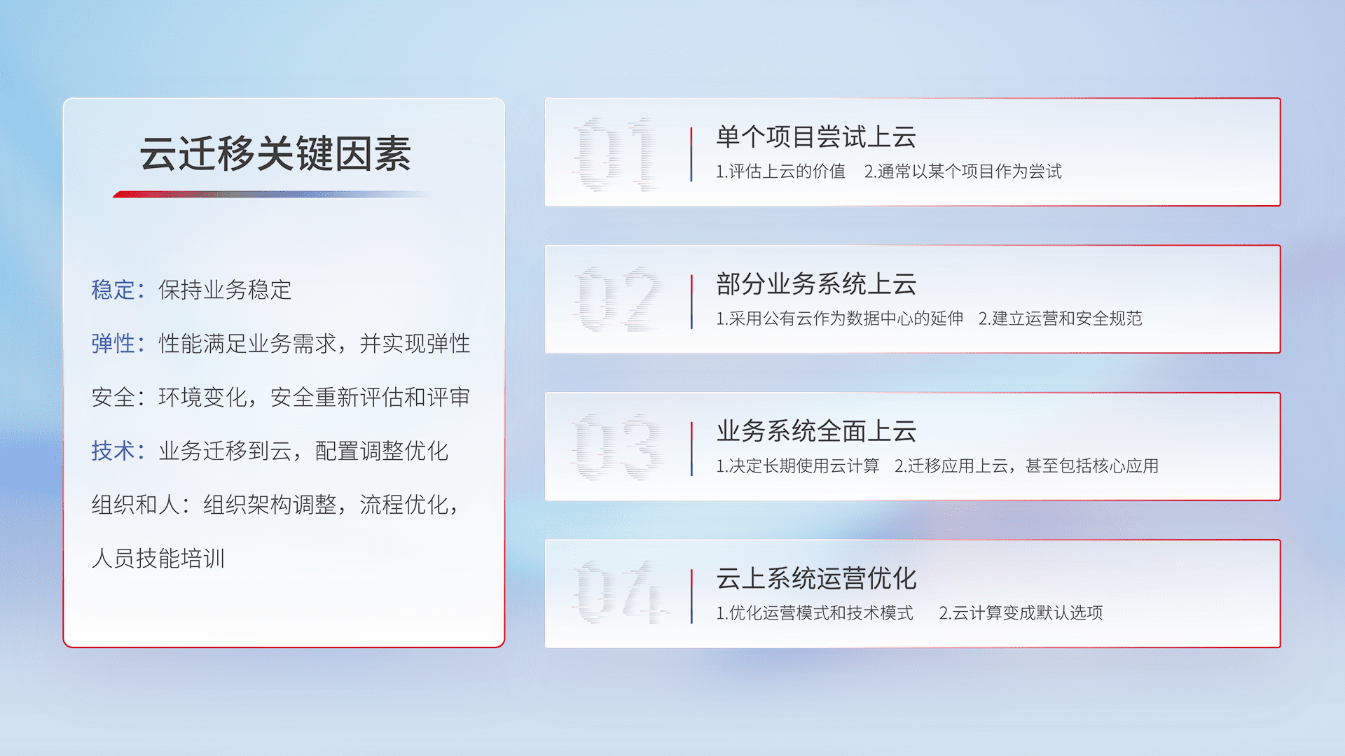 结合实际业务,,,从规划设计、、、云平台选型、、、、云原生改造、、、数据迁移、、、、集成交付,,,,迁移全过程为客户识别最佳上云路径,,,,做好风险识别管理,,,设计网络架构、、、身份权限、、安全审计合规、、、操作审计、、、、日志审计、、、监控告警策略、、、、多站点容灾设计等,,,对云上基础设施进行整体规划,,,提升IT治理水平,,,以满足弹性、、高可用、、、高性能的需求。。